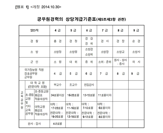 교사는 국가에 귀속된 공무원이므로 제도적 규정에 따라 임금을 보장받는다. 기본적으로 교사의 임금 체계는 공무원의 임금 체계와 결을 같이 하여 호봉제를 적용한다. 그런데 교사는 일반직 공무원 중 ‘담당 업무가 특수하여 자격, 신분 보장, 복무 등에서 우선 적용’되는 ‘특정직 공무원’에 해당한다. 특정직 공무원은 일반직 공무원이 따르는 계급 제도가 없기 때문에 임금 체계에 차등을 두는 급수(1급~9급)제를 따르지 않는다. 즉 9급 공무원, 7급 공무원 등과는 달리 급수를 따르지 않기에 임금 지급을 위해 별도의 규정이 필요하다. 일반직 공무원은 호봉표가 계급에 따라 다르지만, 교사는 계급 구분 없이 동일한 호봉표를 따르기 때문에 별도의 규정이 필요한 것이다. 인사혁신처는 이런 문제를 해결하기 위해 ‘공무원경력의 상당계급기준표’를 제시하여 교육공무원의 ‘호봉’을 기준으로 일반직 공무원의 급수 제도에 맞추어 계급을 제시한다.