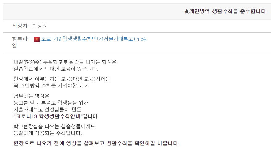 그러나 교생 실습생들의 이런 불안감을 모른척하듯, 코로나19는 끊임없이 신규 확진자를 발생시켰고 결국 2020년 3월 17일, 교육부는 전국 모든 학교의 개학을 2주간 추가 연기하기로 했다. 그리고 3월 26일, 나는 과 조교님으로부터 다음과 같은 공지를 받았다.