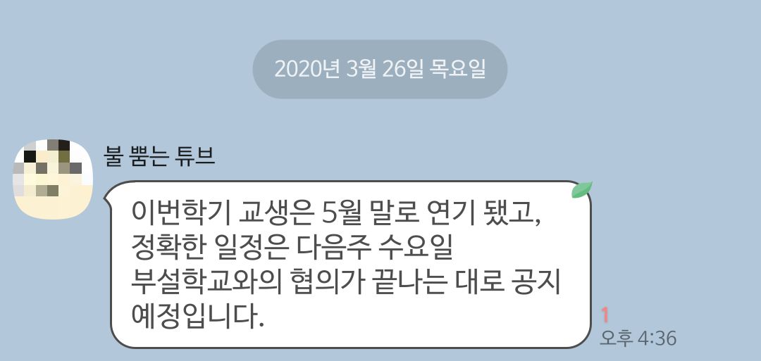2020.03.26. ‘이번학기 교생은 5월 말로 연기 됐고, 정확한 일정은 추후 공지 예정’