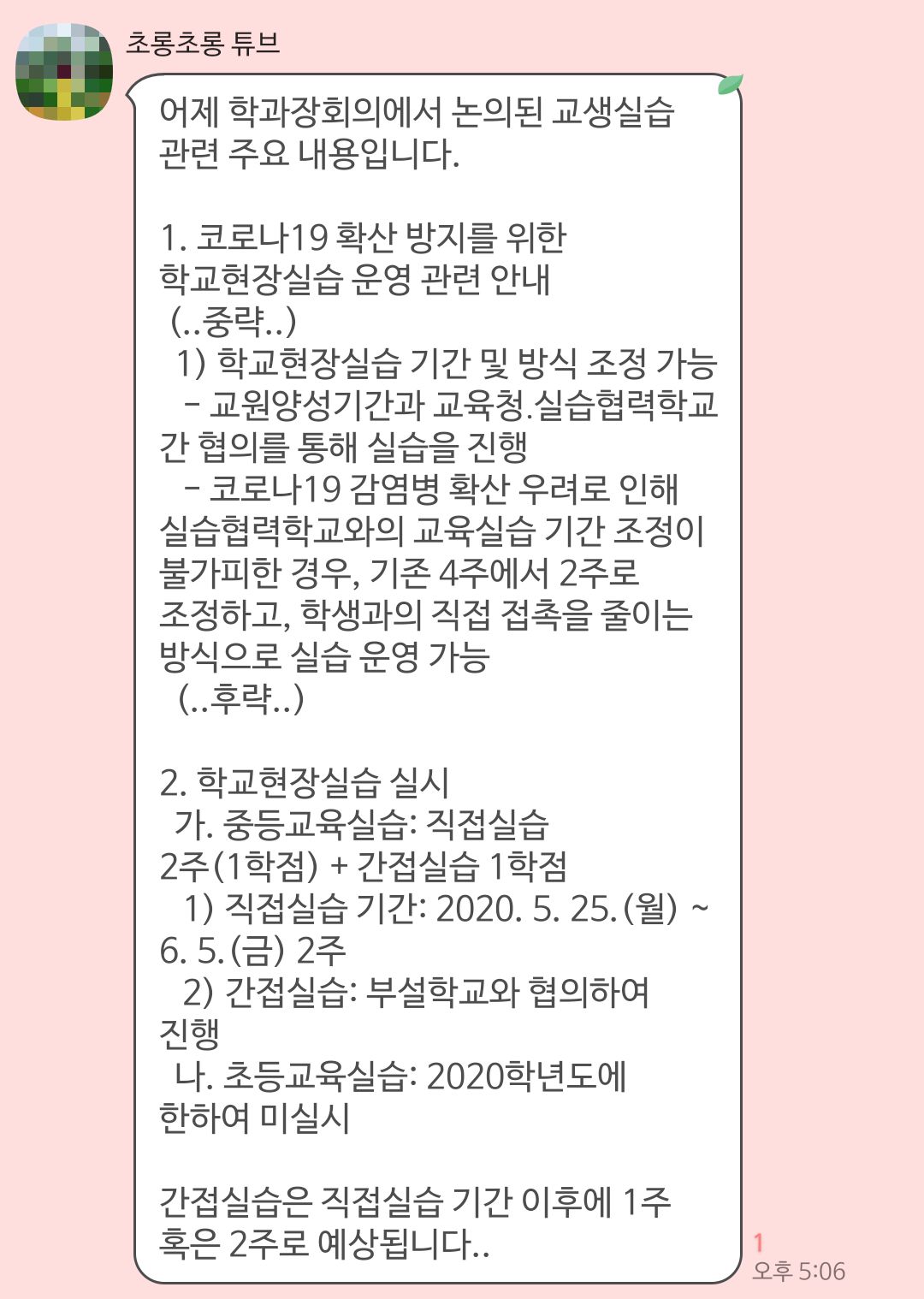 그러나 약 3주간 교생 관련 소식은 감감무소식이었다. 그리고 코로나19는 전혀 종식될 기미를 보이지 않았고, 나의 ‘교생을 과연 나갈 수 있을지’하는 불안감과 ‘이번 학기에 교생을 꼭 하고 졸업을 하고 싶다’라는 열망은 점점 커져만 갔다. 그러던 중 4월 22일, 갑자기 과 조교님에 의해 교생 실습 예정자들을 대상으로 한 카카오톡 톡방이 생겼다. 조교님께서는 톡방을 만들자마자, ‘2020학년도 교육실습 실시계획’이라는 파일을 올려주셨다. 나는 ‘오, 교생 실습 어쨌거나 갈 수 있는 건가(두근)’하는 마음으로 재빨리 열어보았고, 다행스럽게도 지금까지의 그 어떤 공지보다 구체적인 안내들을 받아볼 수 있었다.