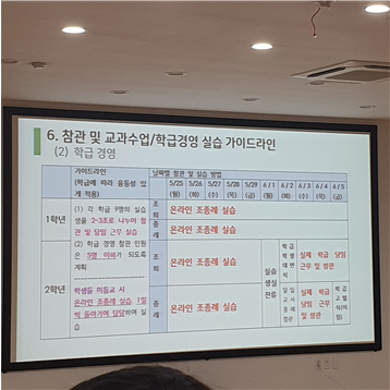 본격적인 사전 교육이 시작되자, 연구지원부장 선생님께서 나오셔서 간단한 인사와 함께 학교실무전체교육을 해주셨는데, 생각보다 교생이 할 일이 정말 많다는 사실과 코로나19로 인해 과제 방식 등 학교의 많은 부분이 변화하고 있음을 깨닫게 되었다.